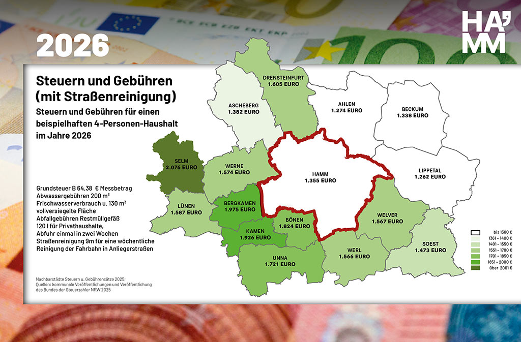 „Wir wollen die Menschen in Hamm so wenig wie möglich belasten und haben hier einiges erreicht – aber ganz ohne Erhöhungen von Gebühren können wir die Kostensteigerungen nicht decken“, erklärte Oberbürgermeister Marc Herter bei der Vorstellung der geplanten Gebühren für 2026. „Die ‚zweite Miete‘ in Hamm bleibt trotzdem weiterhin im Vergleich mit dem Umland sehr günstig“. Die Steuern und Gebühren steigen in Hamm für eine beispielhafte Vier-Personen-Familie von 1.274 auf 1.355 Euro, also um etwa 81 Euro im Jahr. Damit zählt Hamm weiterhin zu den günstigsten Kommunen im Umland. Nimmt man die Kita-Gebühren in den Vergleich hinzu, ist die Stadt Hamm weiterhin mit Abstand am günstigsten im kommunalen Vergleich.