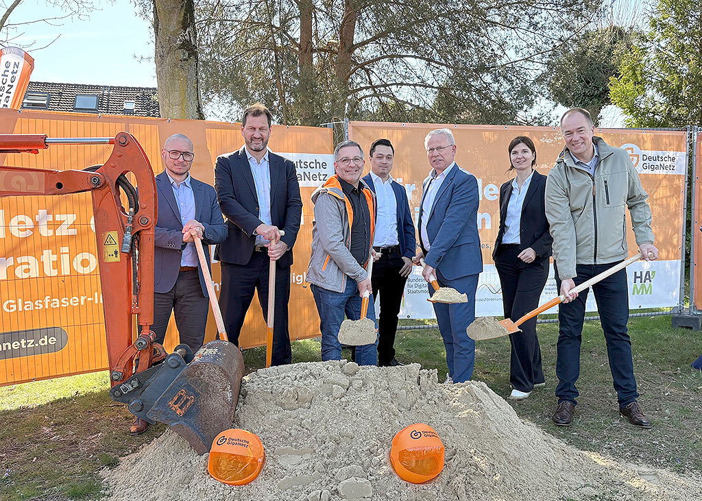 Spatenstich in Hamm-Selmigerheide (v. l. n. r.): Dennis Tepel (Regionalleiter bei der Deutschen GigaNetz), Wolfram Thielen (Geschäftsführer der Deutschen GigaNetz), Marc Herter (Oberbürgermeister der Stadt Hamm), Jeremy Ockenfels (Fördermittelberater von aconium) , Reinhard Bartsch (Geschäftsführer der Stadtwerke Hamm), Mileva Meißner (Geschäftsführerin der Stadtwerke Hamm), Axel Püttner (Bezirksbürgermeister für Pelkum)
