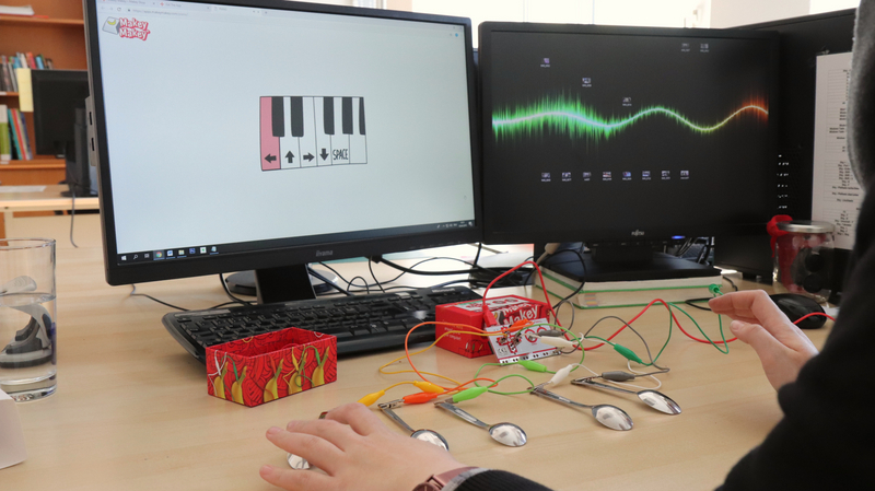 Makey Makey ist eine vielseitige Platine, mit der der Einstieg in kreative Programmierprojekte gelingt. Mithilfe des Erfinder-Kits verwandeln sich leitfähige Alltagsgegenstände in programmierbare Computertasten. So können als einfacher Auftakt ins Making verschiedene Installationen wie Musikinstrumente oder Computerspiele erzeugt werden: die Banane wird zum Klingen gebracht und der Löffel verwandelt sich in eine Maustaste! Für die einfach umsetzbaren Projekte werden weder Computerprogramme noch Programmierkenntnisse benötigt, es kann also direkt ans Ausprobieren gehen und so leicht Motivation und Neugierde geweckt werden. Aufgrund der einfachen Bedienung eignet sich das Experimentieren mit dem Makey Makey für alle Altersgruppen. Der begleitete Einsatz in der Schule empfiehlt sich ab der zweiten Klasse, ab der Sekundarstufe sind auch eigene Projekte möglich.
