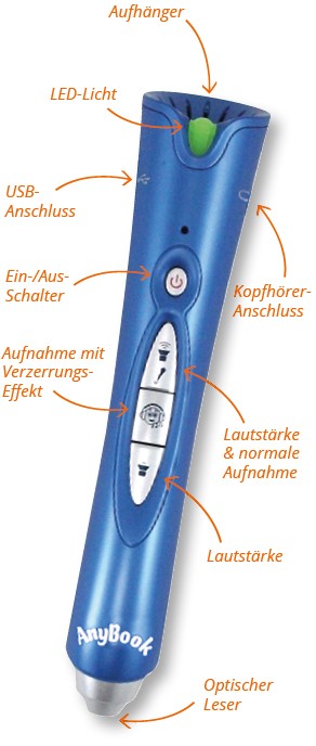 Bei dem Anybook Reader handelt es sich um einen Audiostift mit Aufnahmemöglichkeit. Er kann beliebig besprochen werden und unterstützt den natürlichen Spracherwerbsprozess.