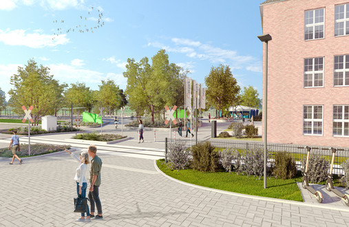 Im Übergang zur Ostwennemarstraße entsteht ein Entréeplatz mit Aufenthaltsmöglichkeiten und rollstuhlbefahrbarem Wasserspiel als Auftakt in das südlich angrenzende Sport- und Bewegungsband, welches sich weiter bis zum Maxipark durchzieht. Der vorhandene Kiefernhain sowie auch die von den Schulabgängern gepflanzten „Abi-Bäume“ werden in das Konzept integriert.